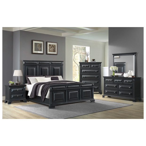 This luxurious black finish and tri-panel design on the headboard and footboard, this King bedroom set will instantly transform your space into a serene sanctuary. The ample drawer space provides plenty of storage for all your essentials, while the sleek black metal hardware adds a touch of modernity. (includes bed, dresser, mirror and nightstand)